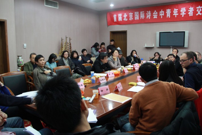 On Nov 23, a symposium on “Voice of Poetry” was held by the Chinese Poetry Institute who hosted the guest poets and most activities. The symposium were attended by all the guests as well as many prominent poets from Beijing: Wang Jiaxin, Xi Chuan, Shu Cai, Xi Du, Jiang Tao, Zhang Taozhou, Li Li, Jing Wendong, Leng Shuang, Wang Dongdong, Lȕ Yue, etc. Although the topic seems to be vague, the discussion was very interesting. Marko opened the dialogue and Vladimir contributed his “three cents”. Ivan was quiet but made interesting remarks too. Poets on the China side were all very serious and interacted very well with the guests. Zhang Guangxi (a PhD candidate in poetry at the nearby university) talked about how he perceived voice of poetry and analyzed Marko’s poems which was amazingly insightful. I was surprised that he would have prepared so well. As a matter of fact all poets showed interest in contemporary Croatian poetry. The institute made copies of the translation I did on Ten Croatian Poets and passed on to everyone in a manila envelope — they were reading the poems while engaging in the discussion.