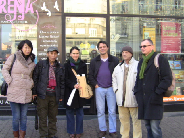 On Dec 4th, 2011, I took Sun and Mo Fei to Zagreb. Our round trips were sponsored by Pan Xichen, chief editor of Poetry Reading Quarterly in China. I never met Pan in person, but he agreed to support the exchange program as soon as I made the initial phone call to him. Pan Xichen was unable to join us, Duo Duo was unable to join us either. Three of us took a long way to arrive in Zagreb as there’s no direct flight, and we were greeted by Tomica, Ana, and Miroslav Kirin (right most in the picture) who had kindly translated our poems into Croatian (although his translation of my poems was duplicate work that I felt sorry about — he didn’t know that Damir Šodan had made the translation ahead of time).