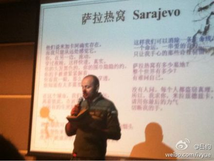 Ivan Herceg was reading. Behind him was the Chinese translation of the poem on the screen. About 30 poets read that evening but I was too busy to take pictures. (I found this picture later on Lȕ Yue’s facebook.)