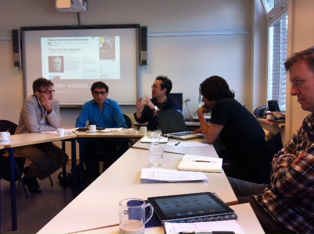 图3-6: 6月15日鹿特丹,诗国际网站编辑会议,在座的有鹿特丹诗歌节邀请的八位编辑,网站主编梅庚,诗歌节三位负责人(巴斯,科林,杨)。明迪,随手拍