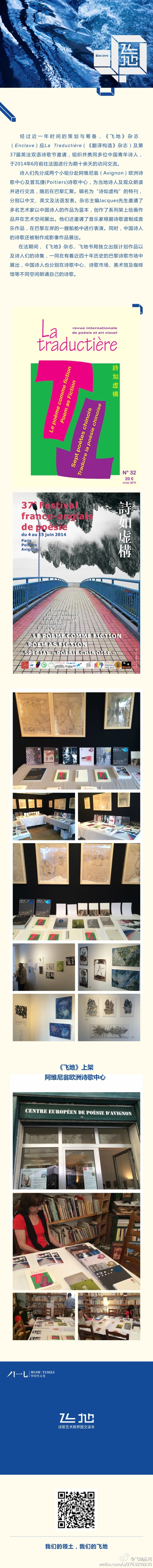 经过近一年时间的策划与筹备,《飞地》杂志(Enclave)应La Traductière(《翻译构造》杂志)及第37届英法双语诗歌节邀请,组织并携同多位中国诗人,于2014年6月前往法国进行为期十余天的访问交流。