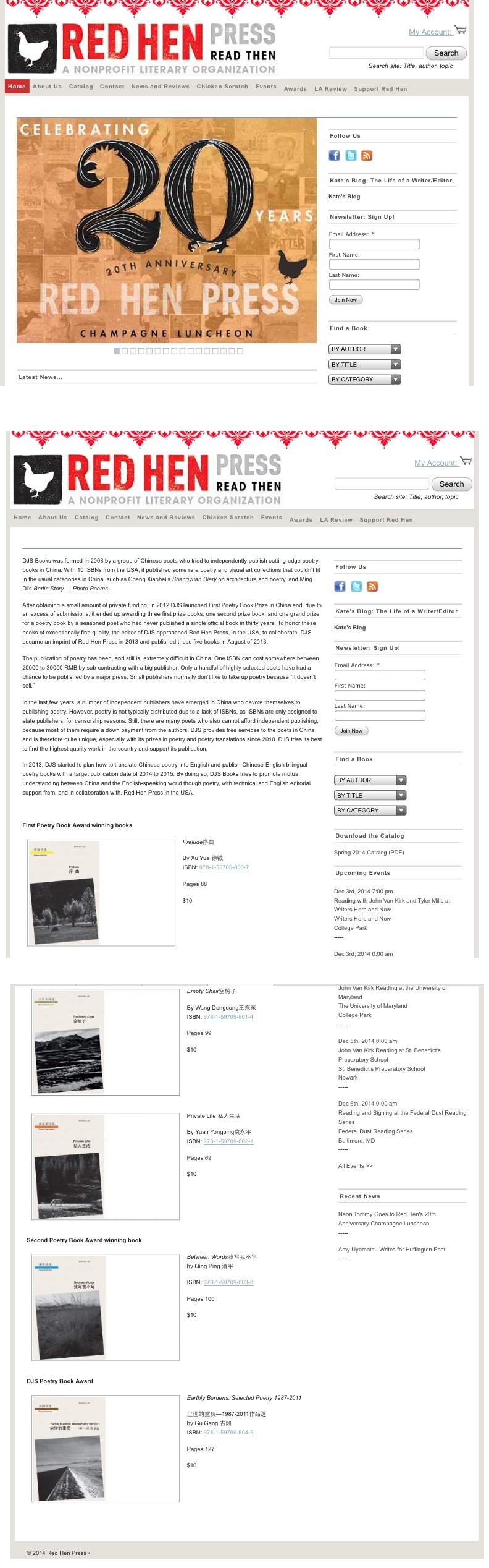 DJS BOOKS is proud to be an imprint of Red Hen Press and will continue to collabrate with them in 2015 in publishing Chinese-English bilingual poetry books. The first series of five titles in Chinese can be ordered from their website, from their Home page click DJS Books under “About Us”.