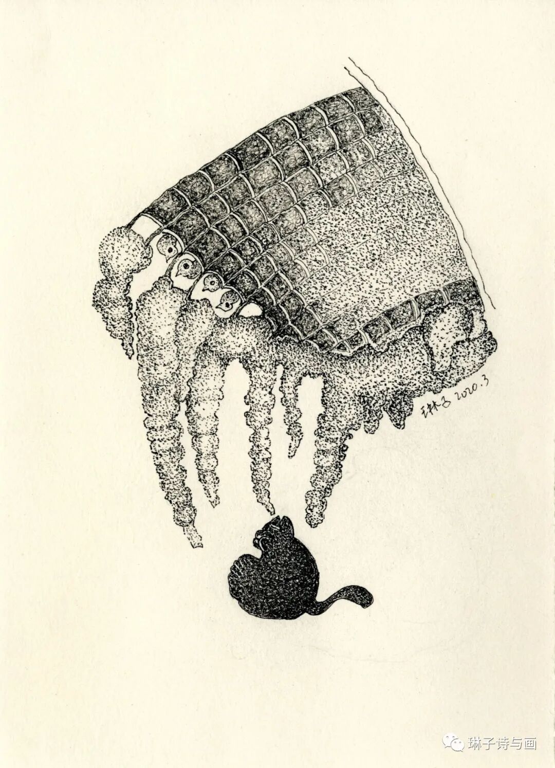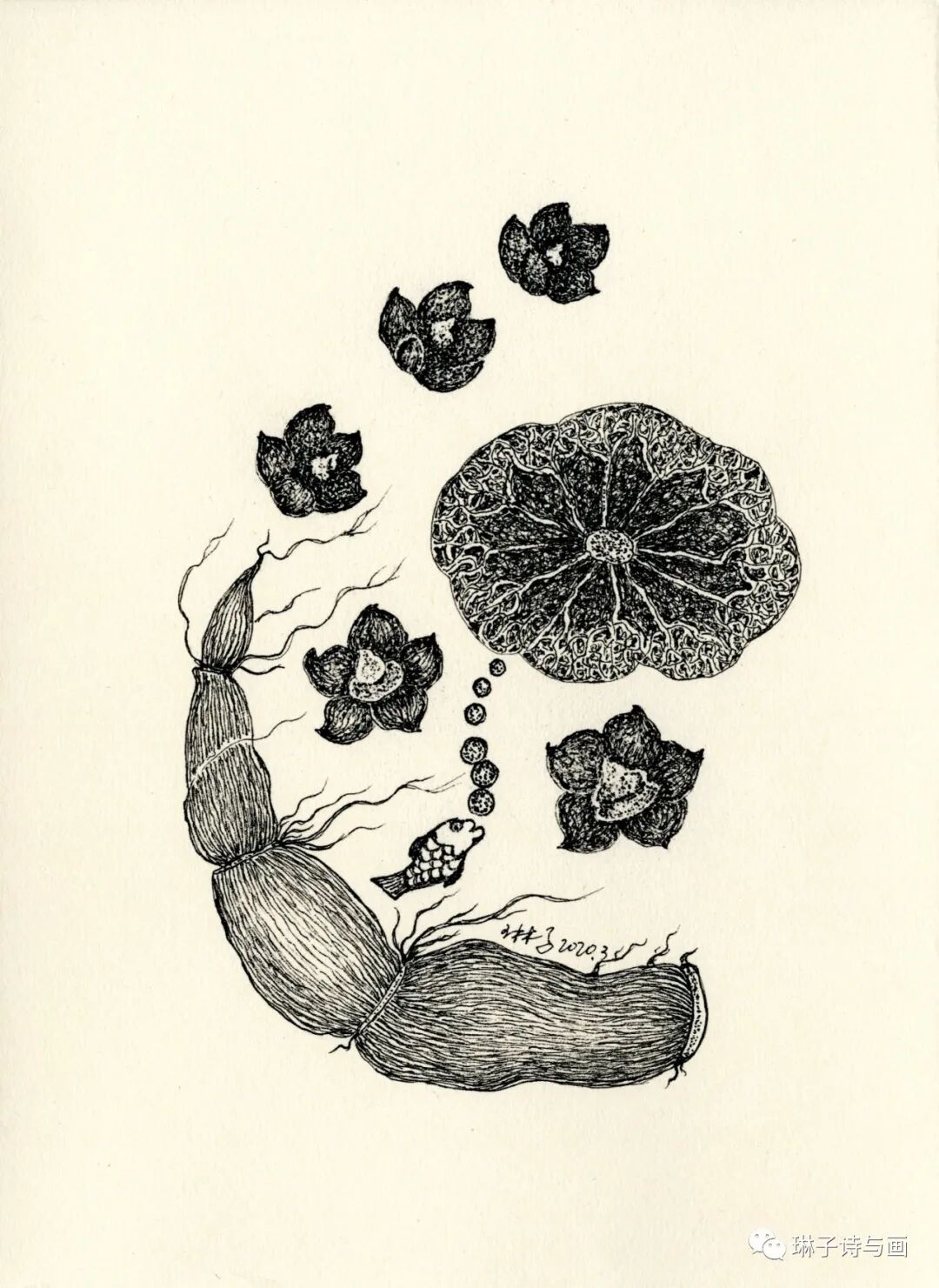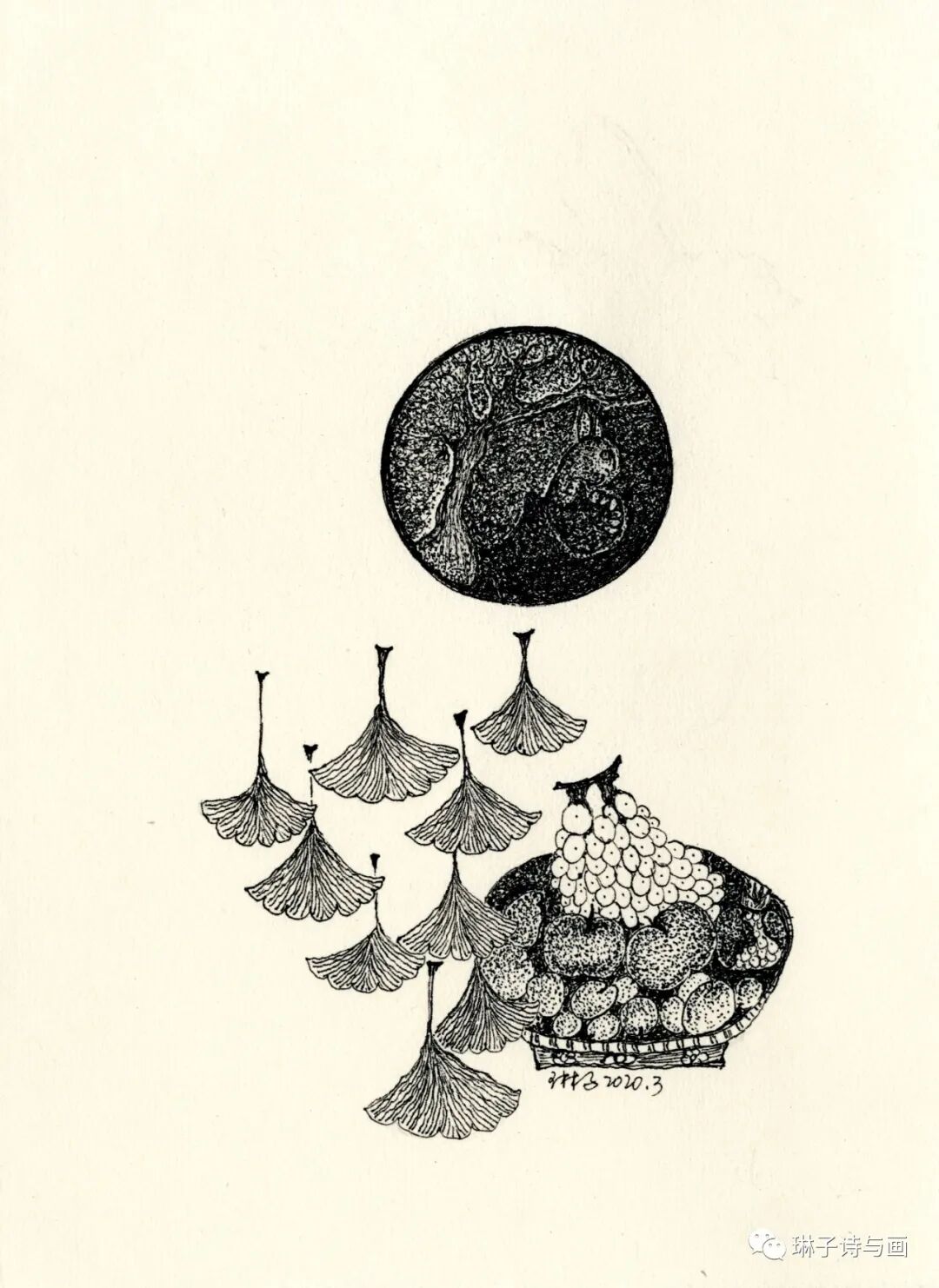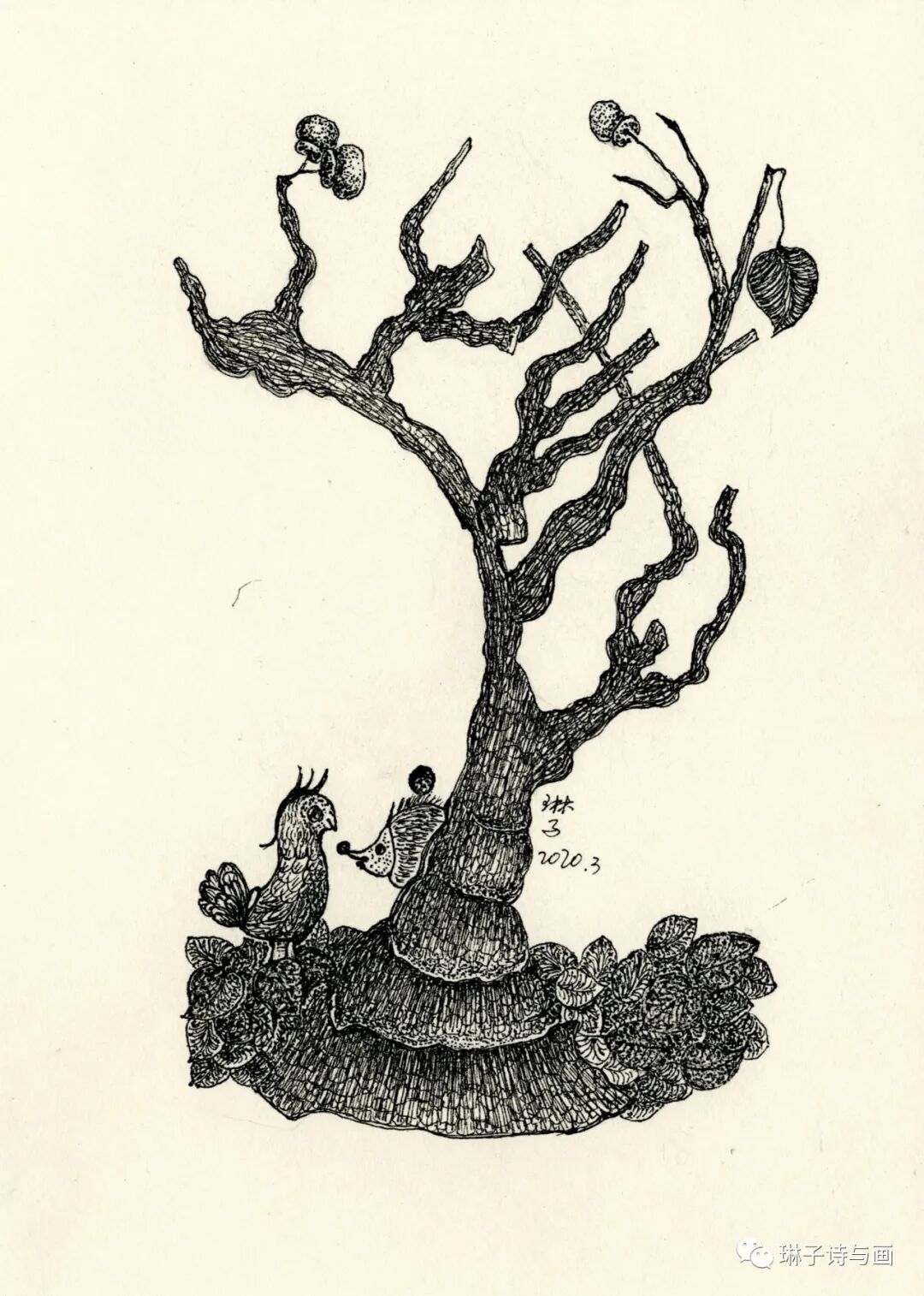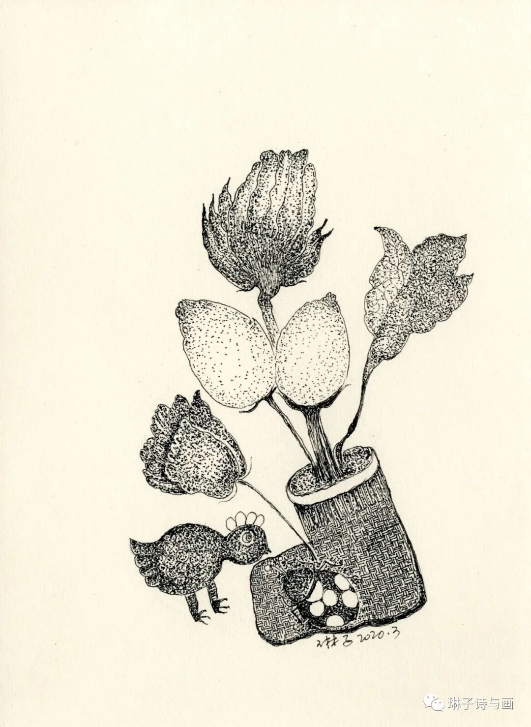 琳子,出生河南滑县,河南省文学院签约作家,北京上苑艺术馆2018年驻留艺术家。出版诗画合集《花朵里开花》、诗集《最好的太阳》等文本多部。童话散文集《草手镯》获“河南省第六届文学艺术优秀成果奖”。2017年为《解放军文艺》创作全年封面图案,2019年和2020年为《诗歌月刊》创作全年封面图案。“与诗同在——琳子钢笔画个展”2018年9月在北京上苑艺术馆举办。