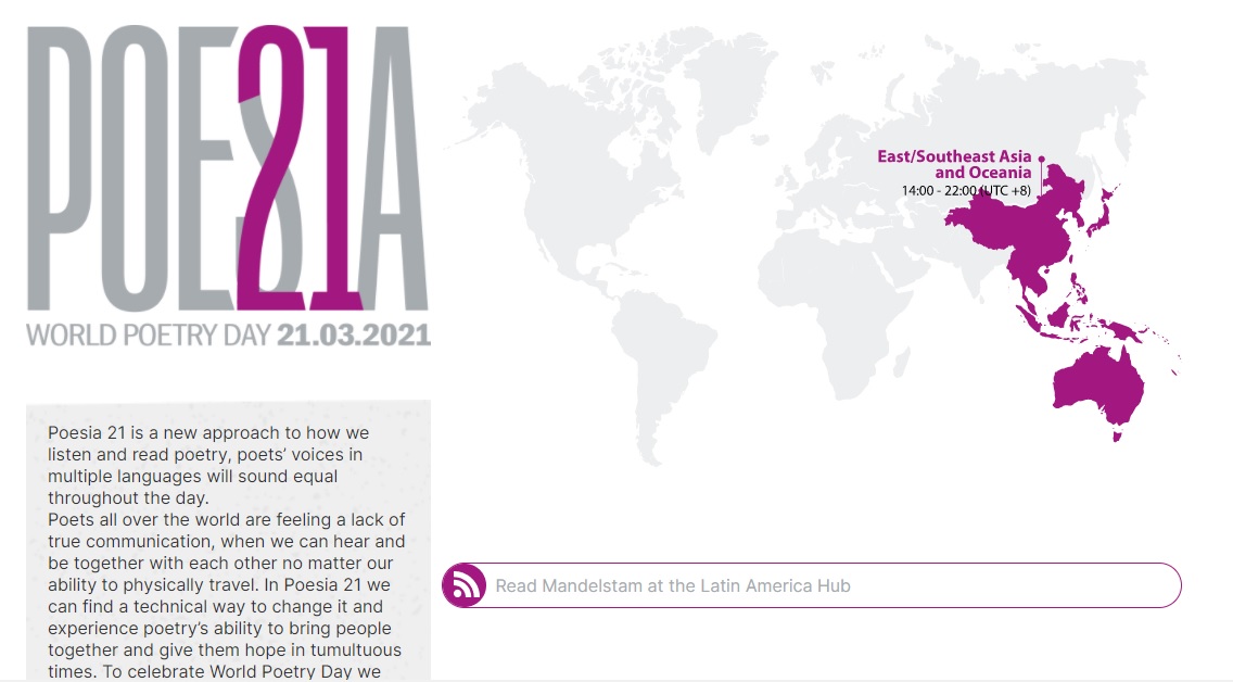 全球分为8个频道现场直播,第一个频道为“东亚/东南亚/大洋洲”频道,https://poesia.world/hub/east-southeast-asia-oceania 由中外诗人共同主持,时间为中国时间3月21日下午2点到晚上10点,分四个单元: