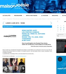 The 16th Berlin Poetry festival 第16届柏林诗歌节~~中国诗歌专题 http://www.literaturwerkstatt.org/de/presse/pressemitteilungen/16-poesiefestival-berlin-weltklang-nacht-der-poesie Google translation: 16 poesiefestival berlin: Weltklang – Night of Poetry 25/03/2015 The poetry festival berlin traditionally opens with Weltklang – Night of Poetry. On June 19, get outstanding artists from around the world