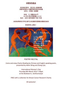 On March 8th 2012, the International Women’s Day celebrated in China, a reading was organized by British poet Helen Wing at Bookworm’s in Beijing: